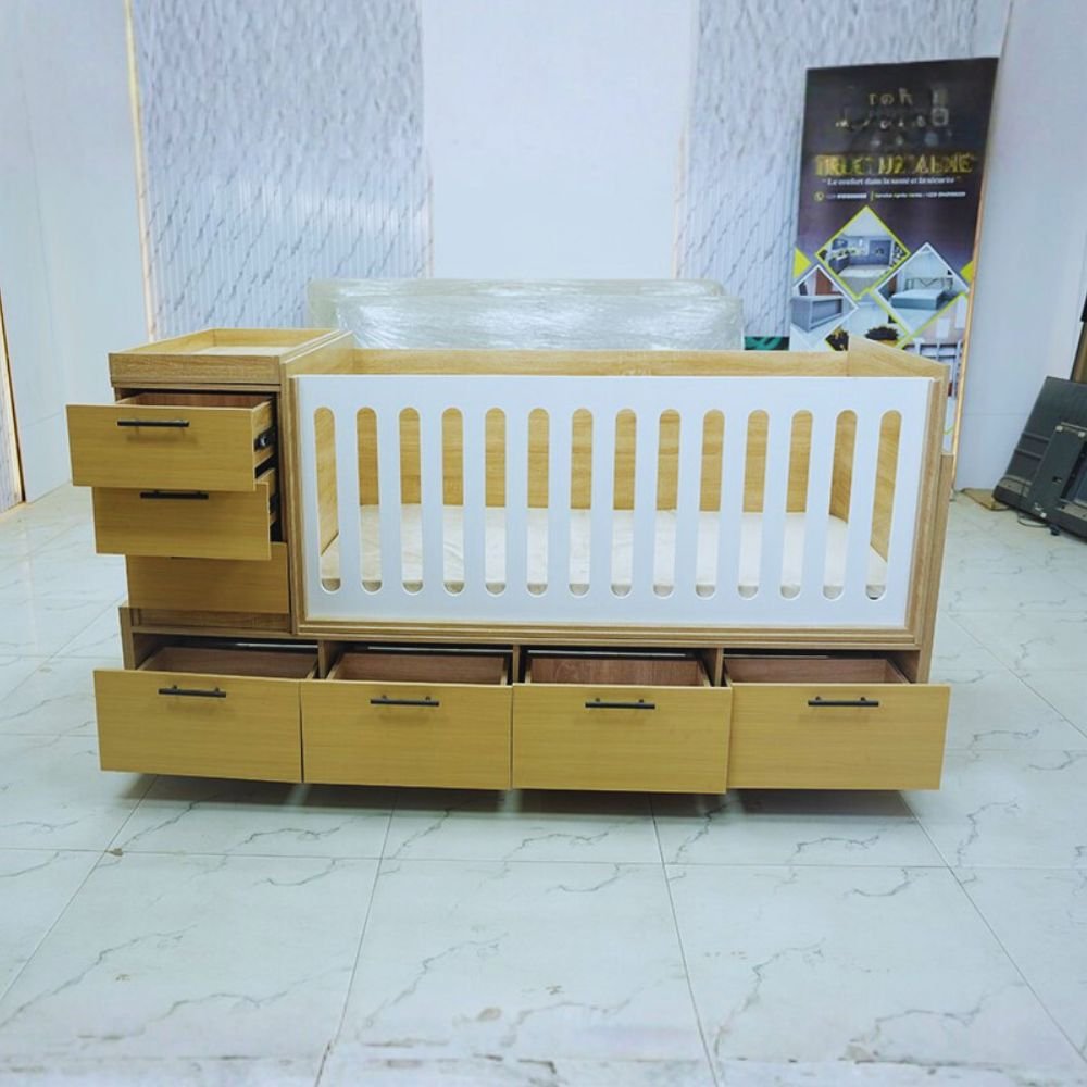 Optimisez la chambre de votre nouveau-né avec ce lit bébé combiné ultra-fonctionnel. Alliant un design scandinave moderne et une capacité de rangement maximale, ce meuble intelligent regroupe un espace de couchage sécurisé, une commode latérale et de grands tiroirs de soubassement. C’est la solution idéale pour les petits espaces sans compromis sur le style.